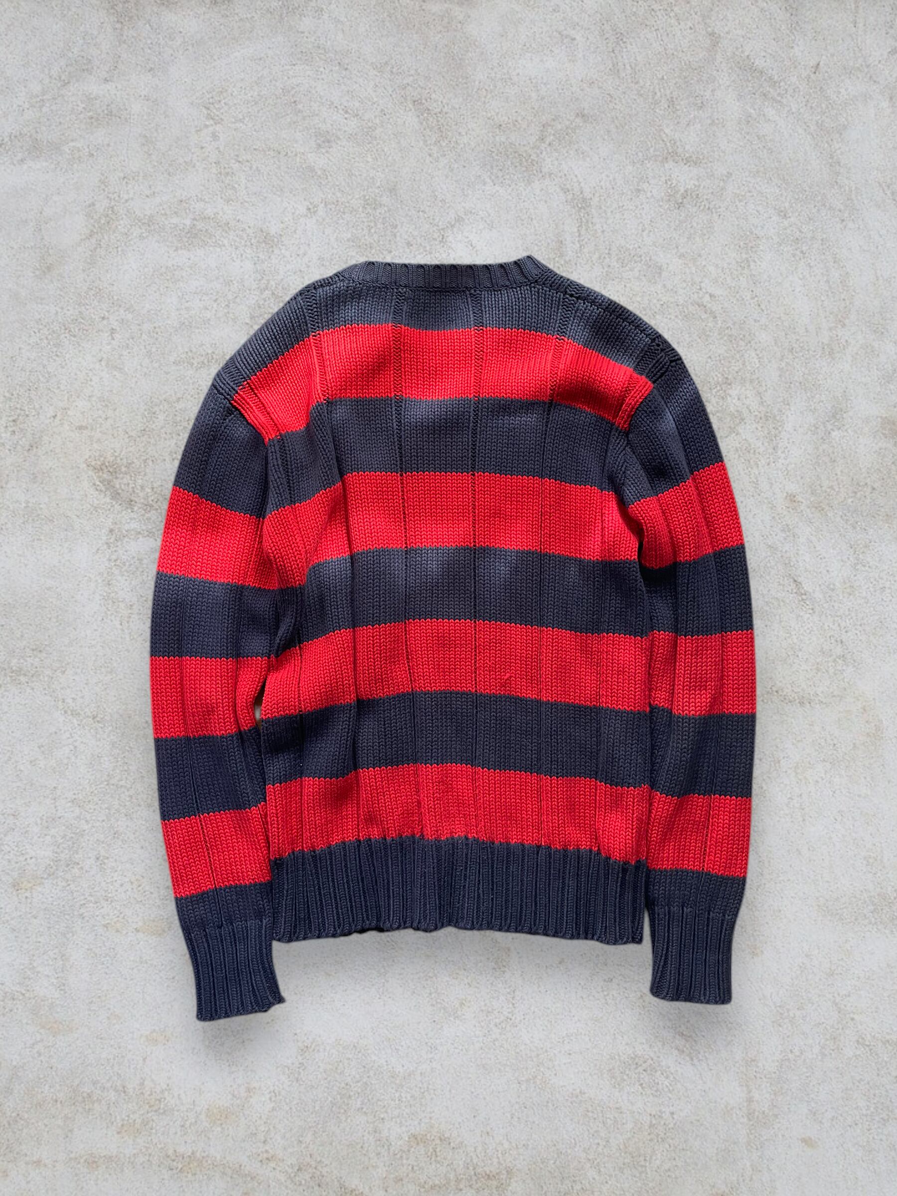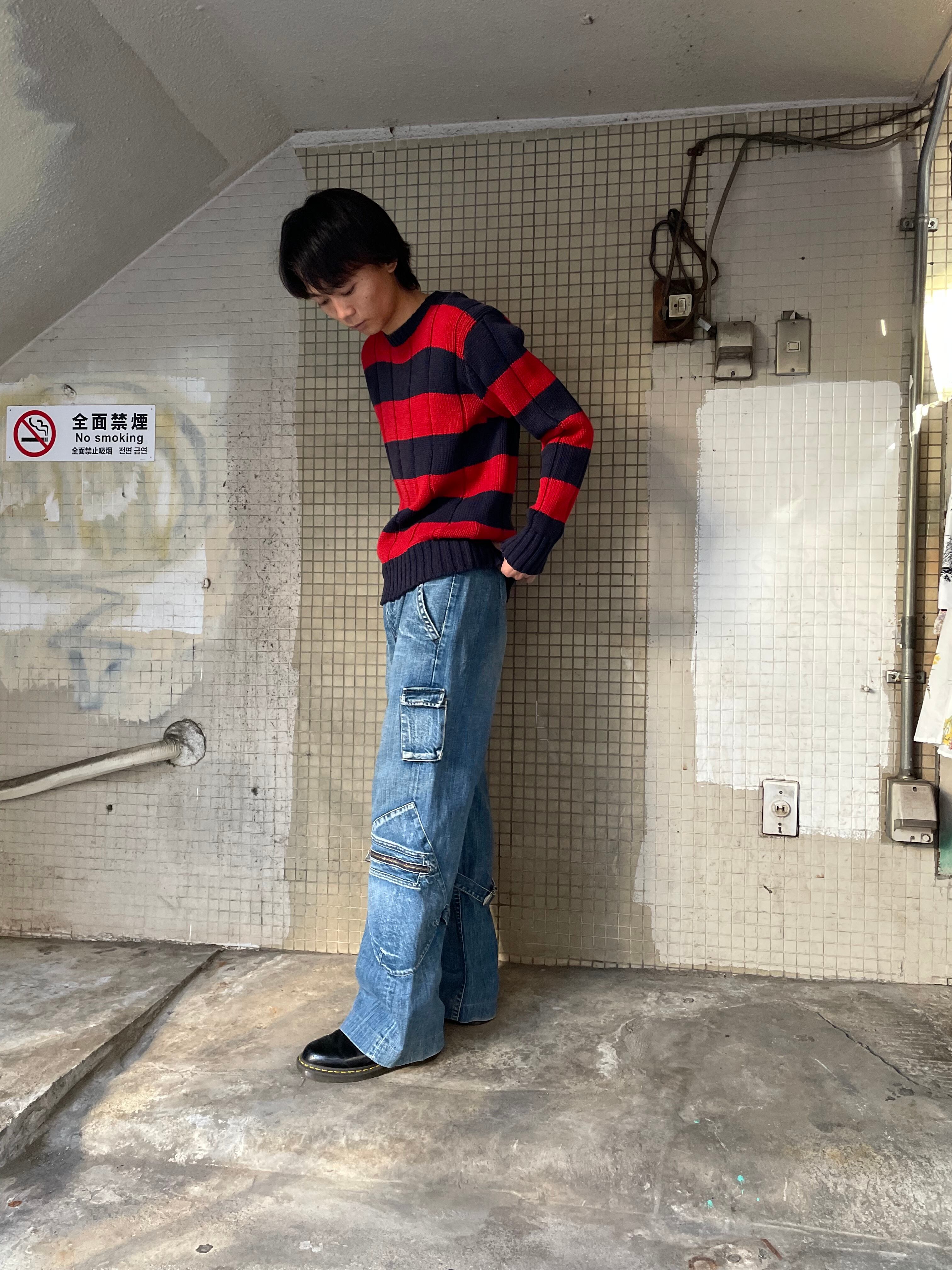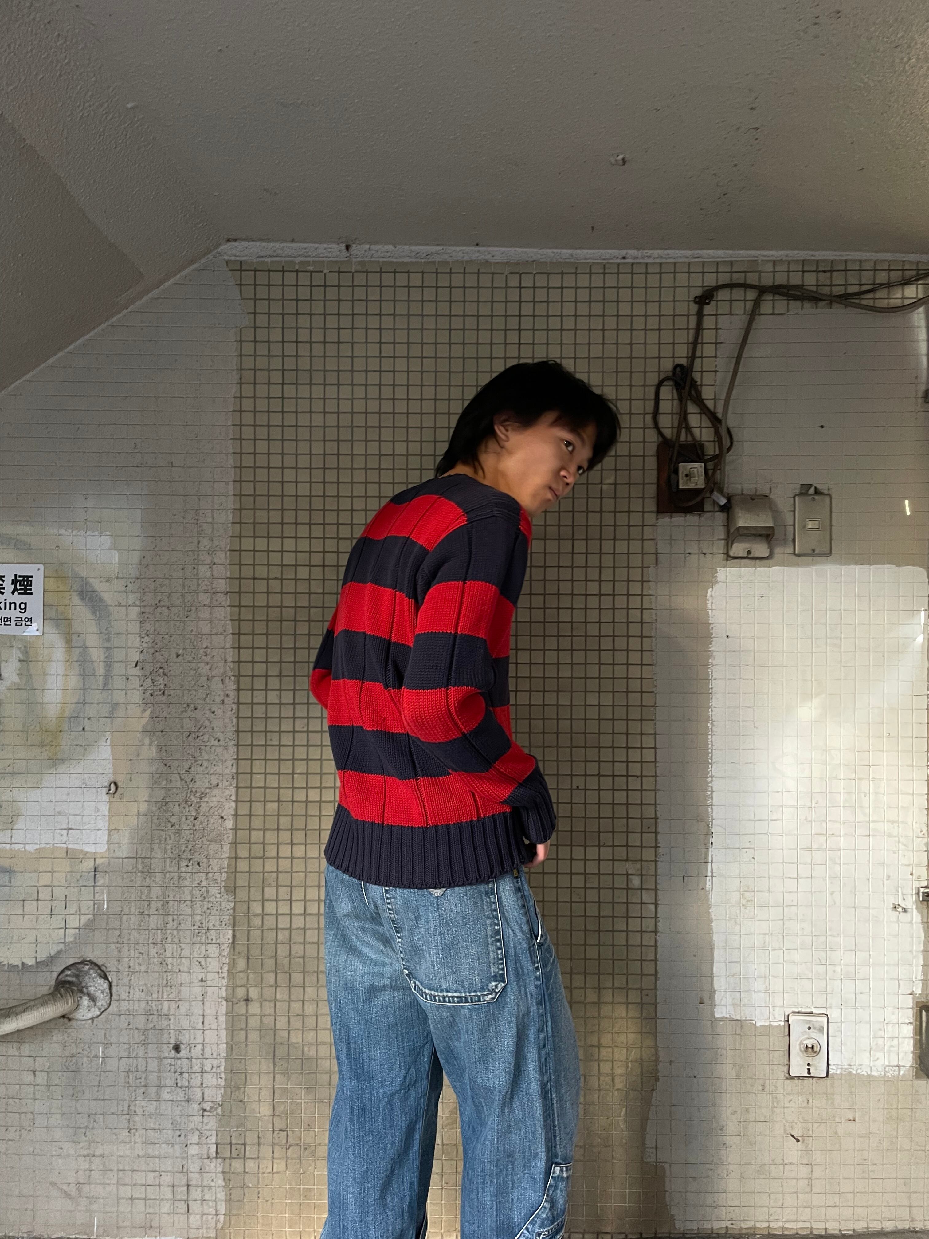 ネイビー×赤のプレッピーで何処かY2Kスタイルも感じます。