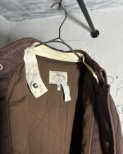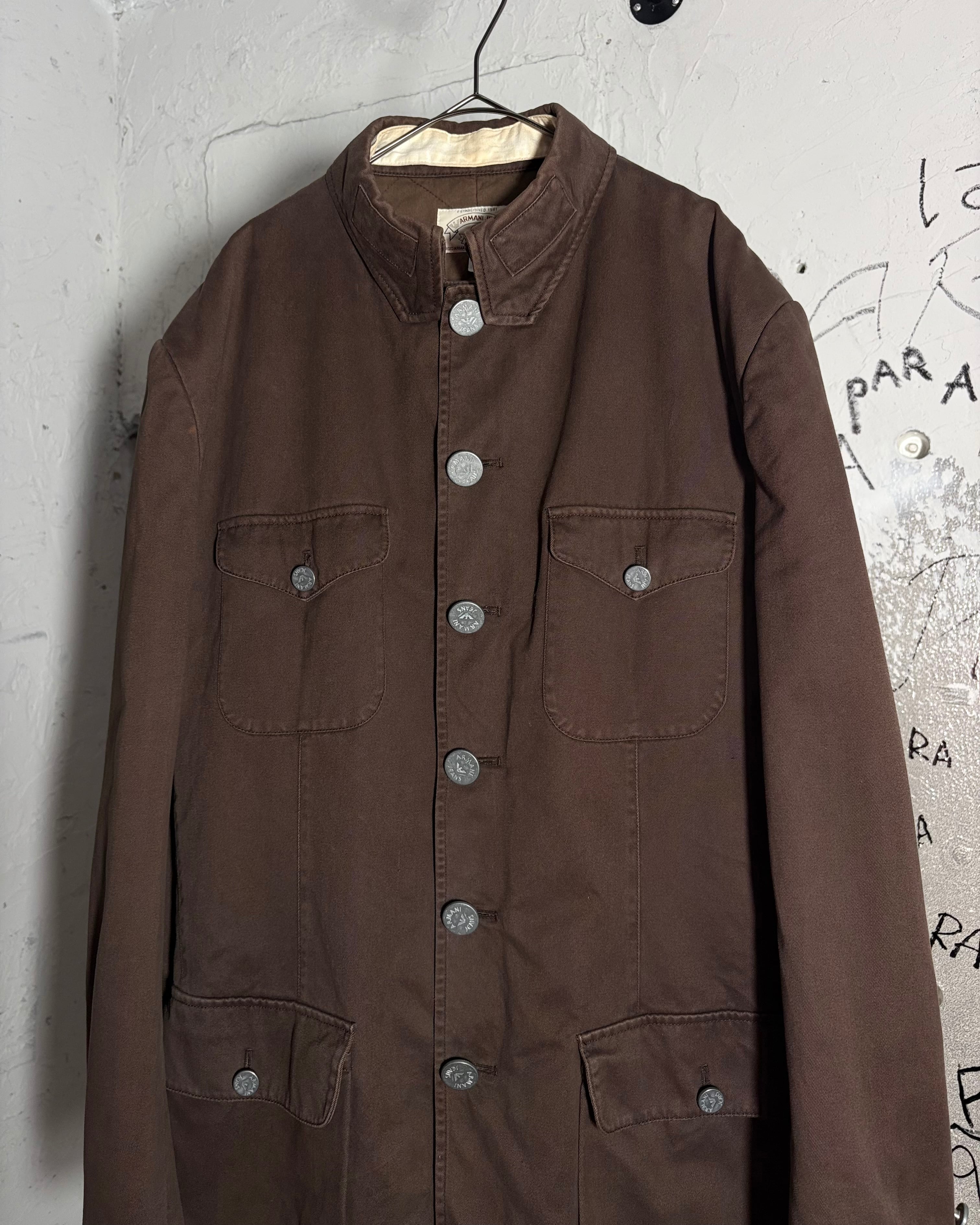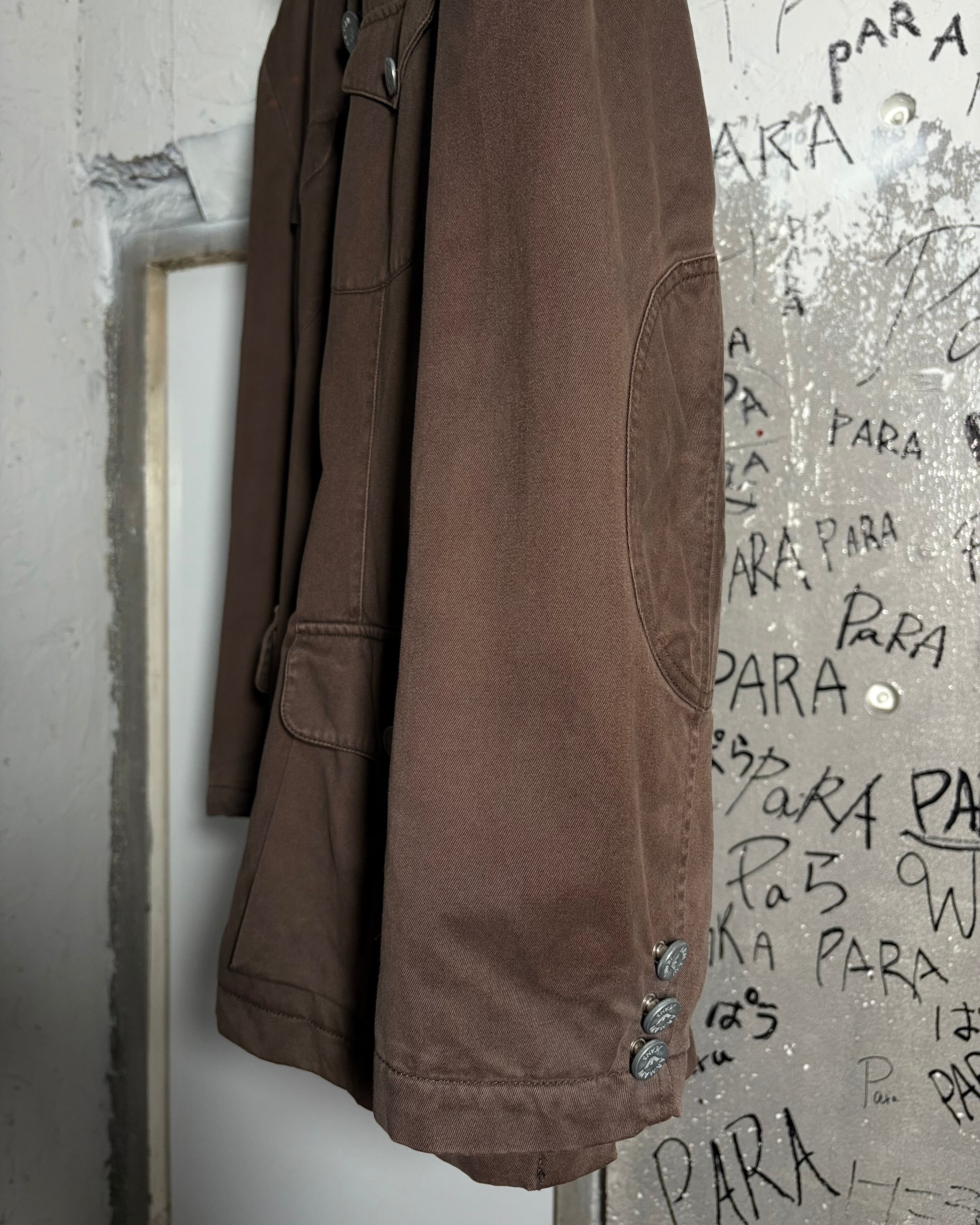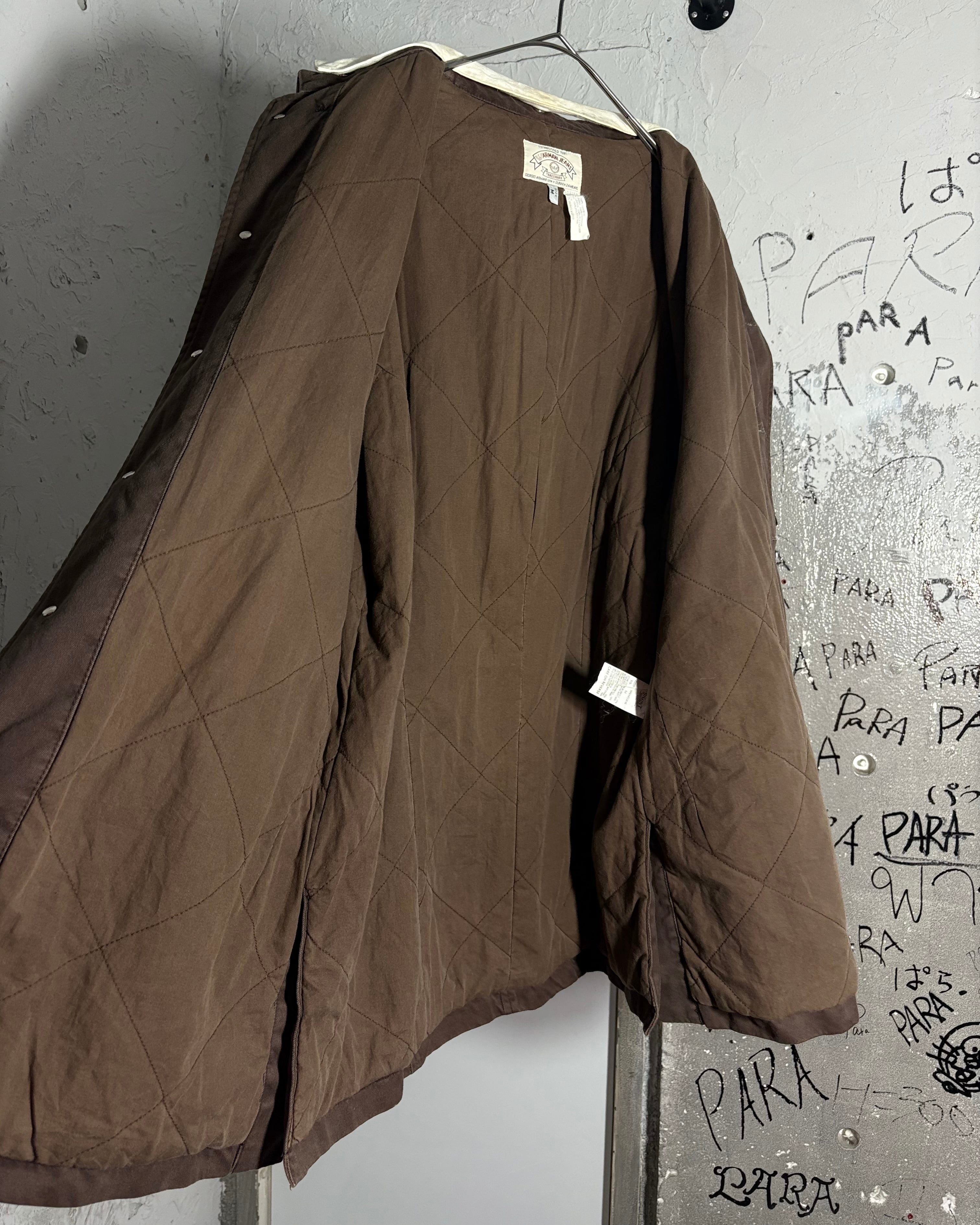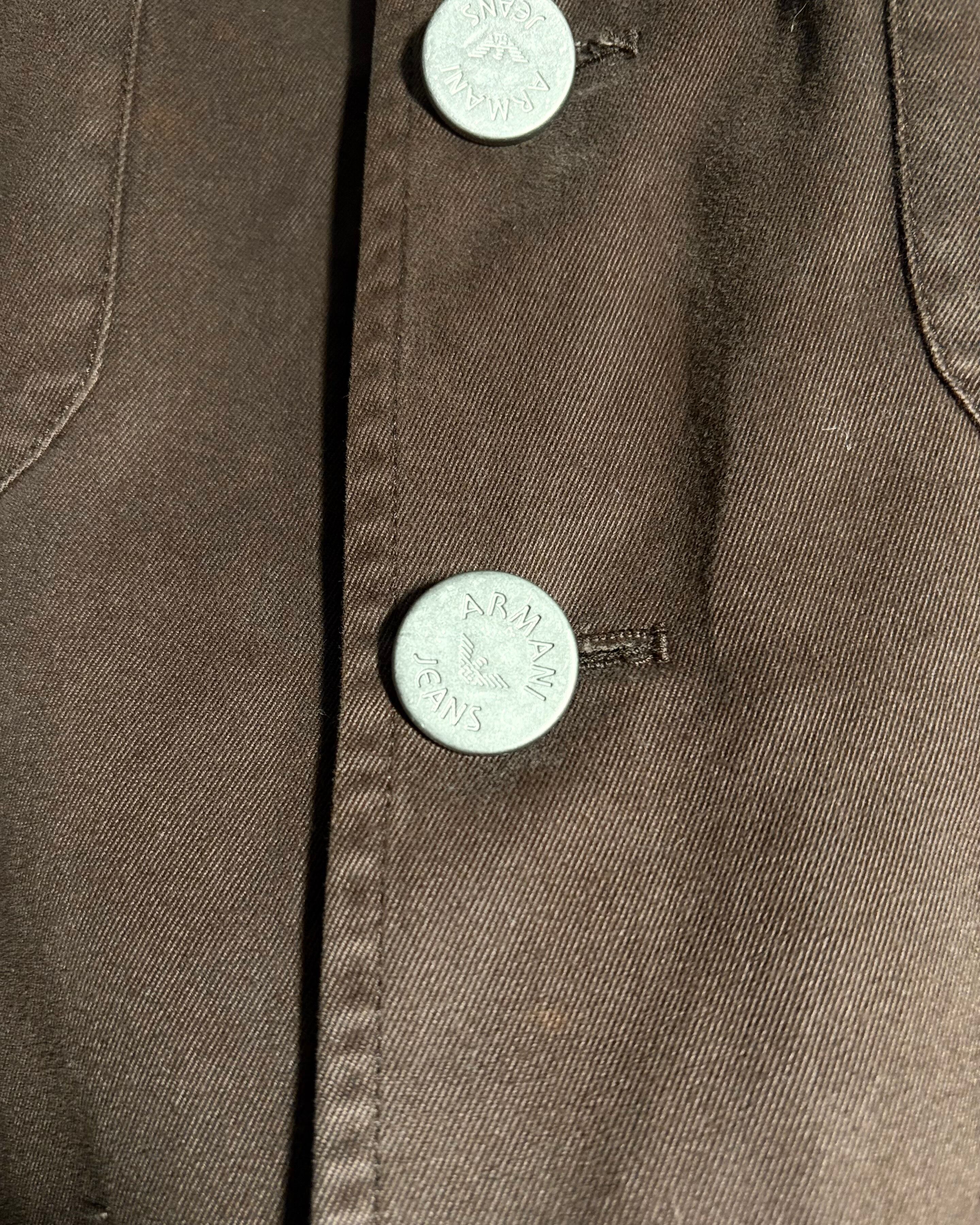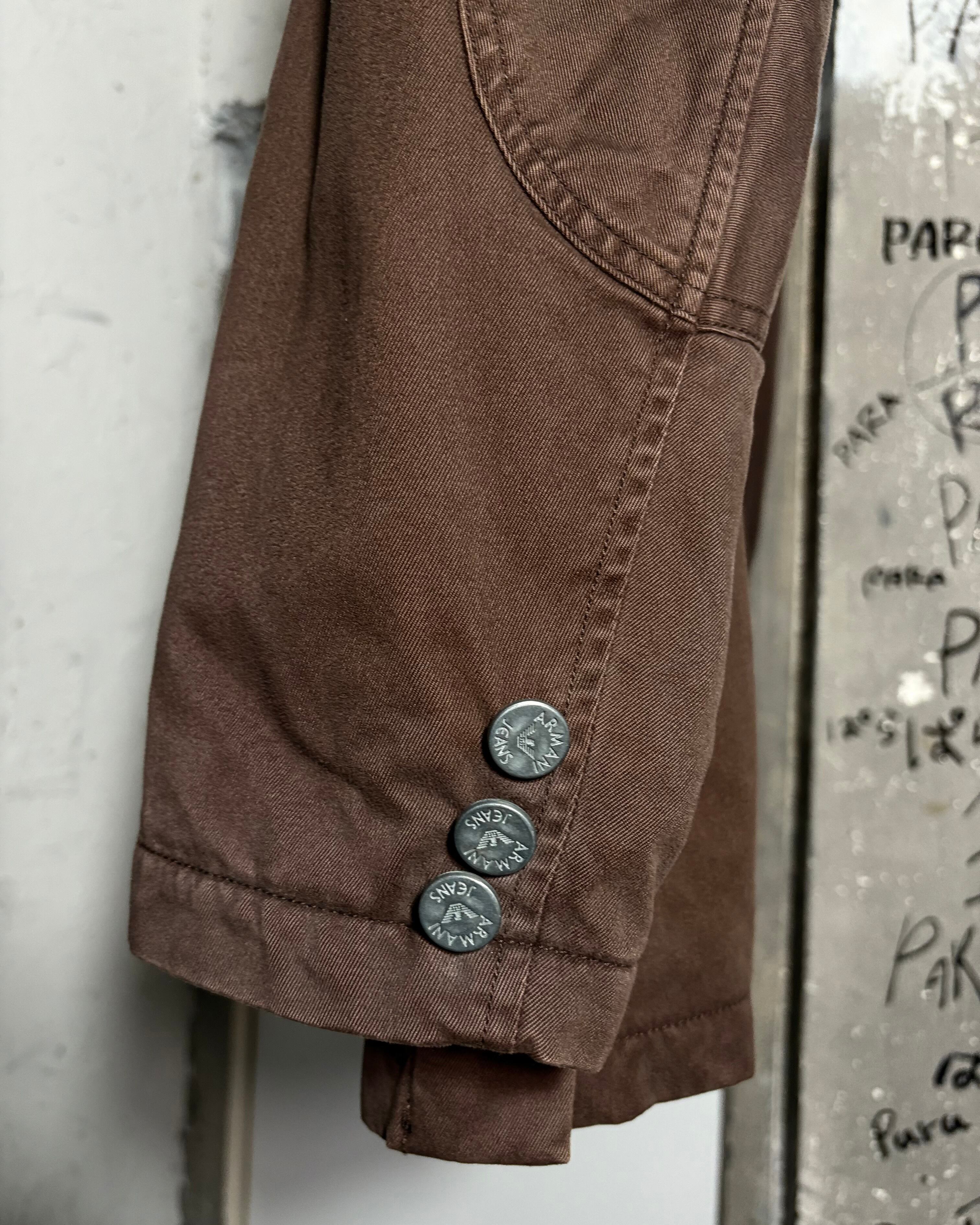 コットン地のモカブラウンに鉛のような色味の刻印ボタンがクラシックで品のある雰囲気。