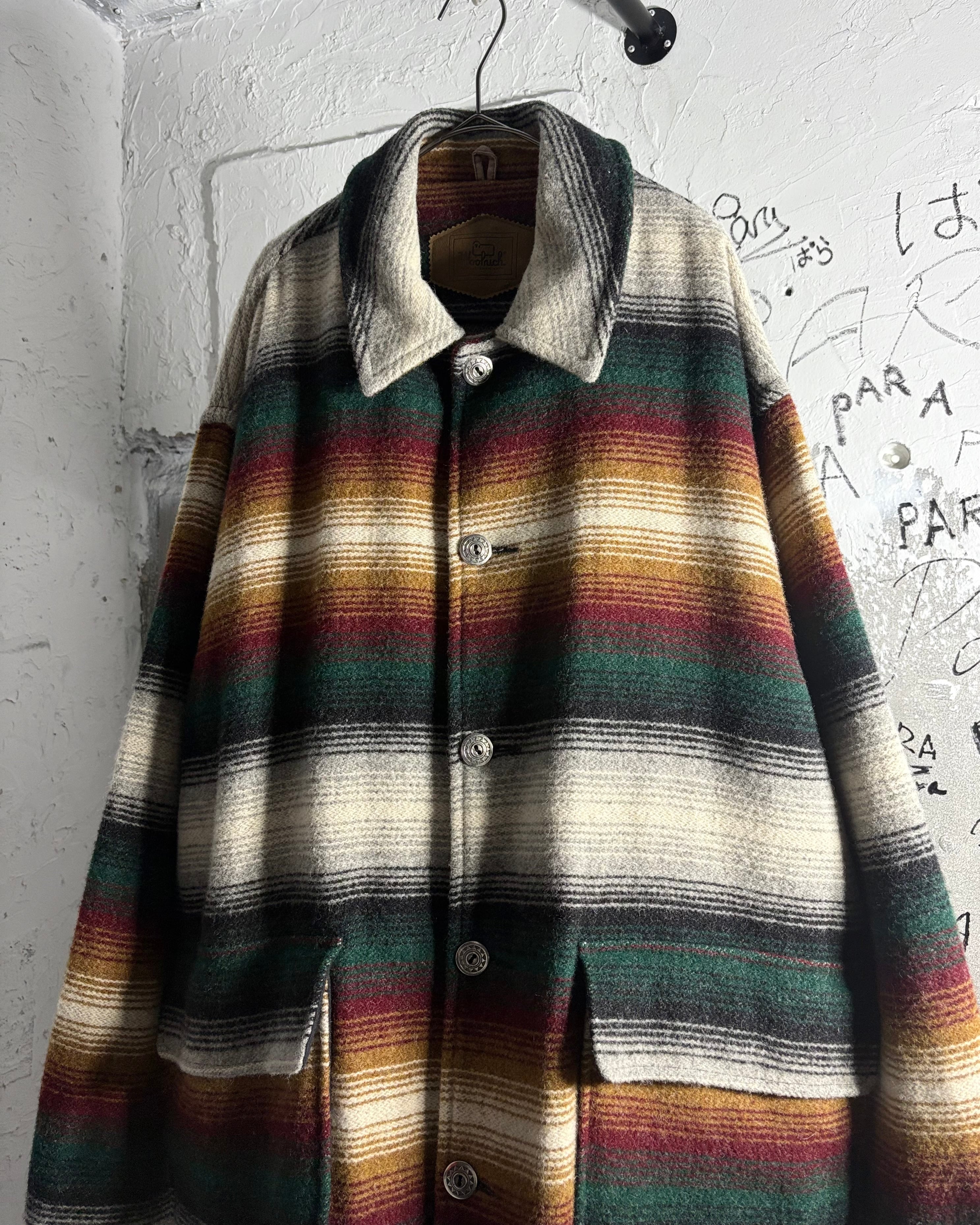 実用の中で生まれたブランケットウールのネイティブボーダーのカバーオール。