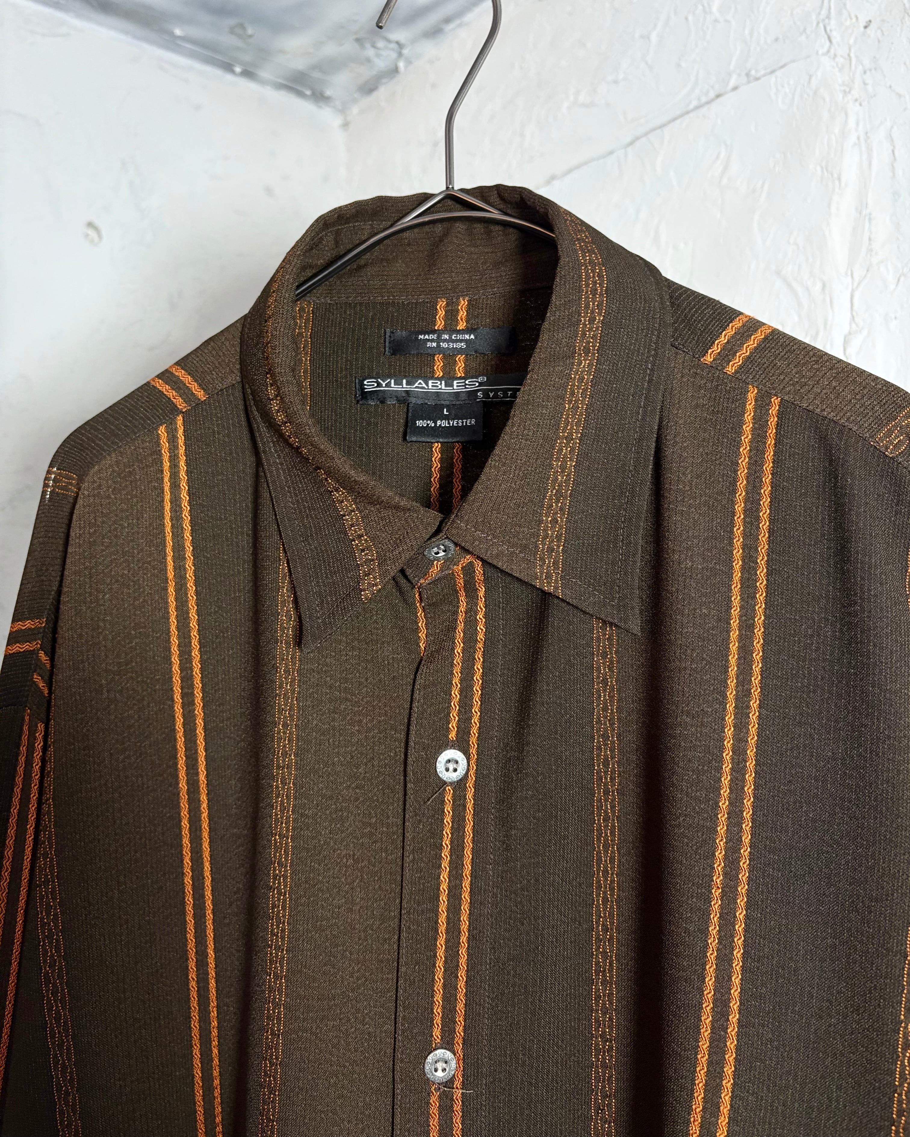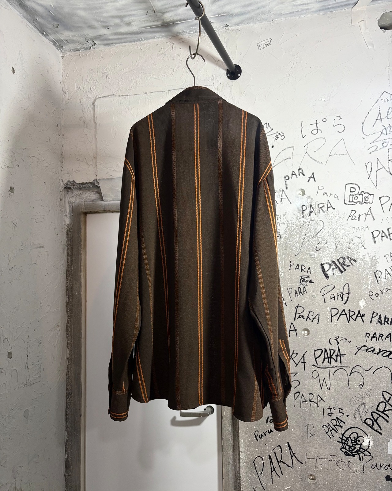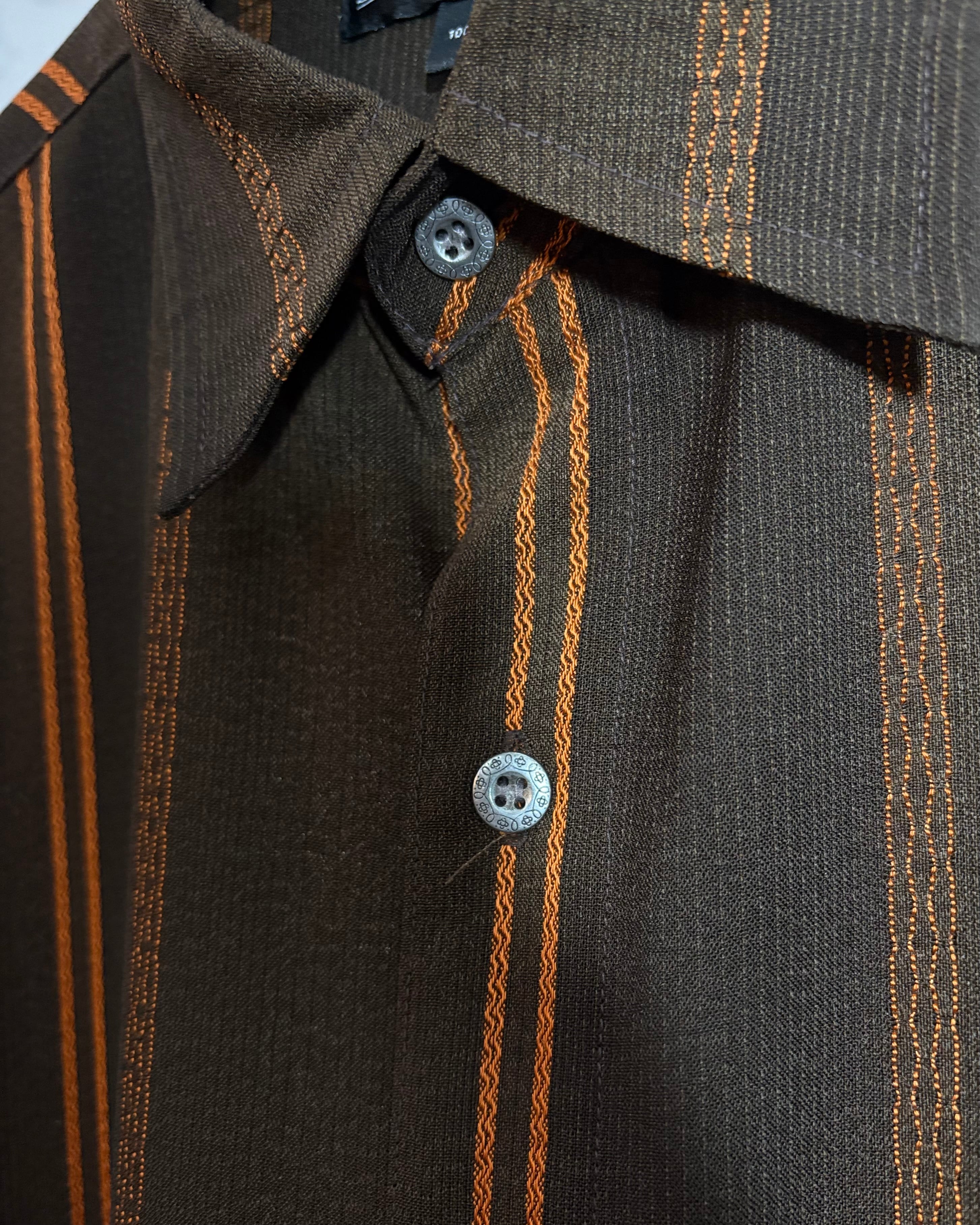ダークブラウンベースにオレンジ〜アンバー寄りストライプ柄シャツ