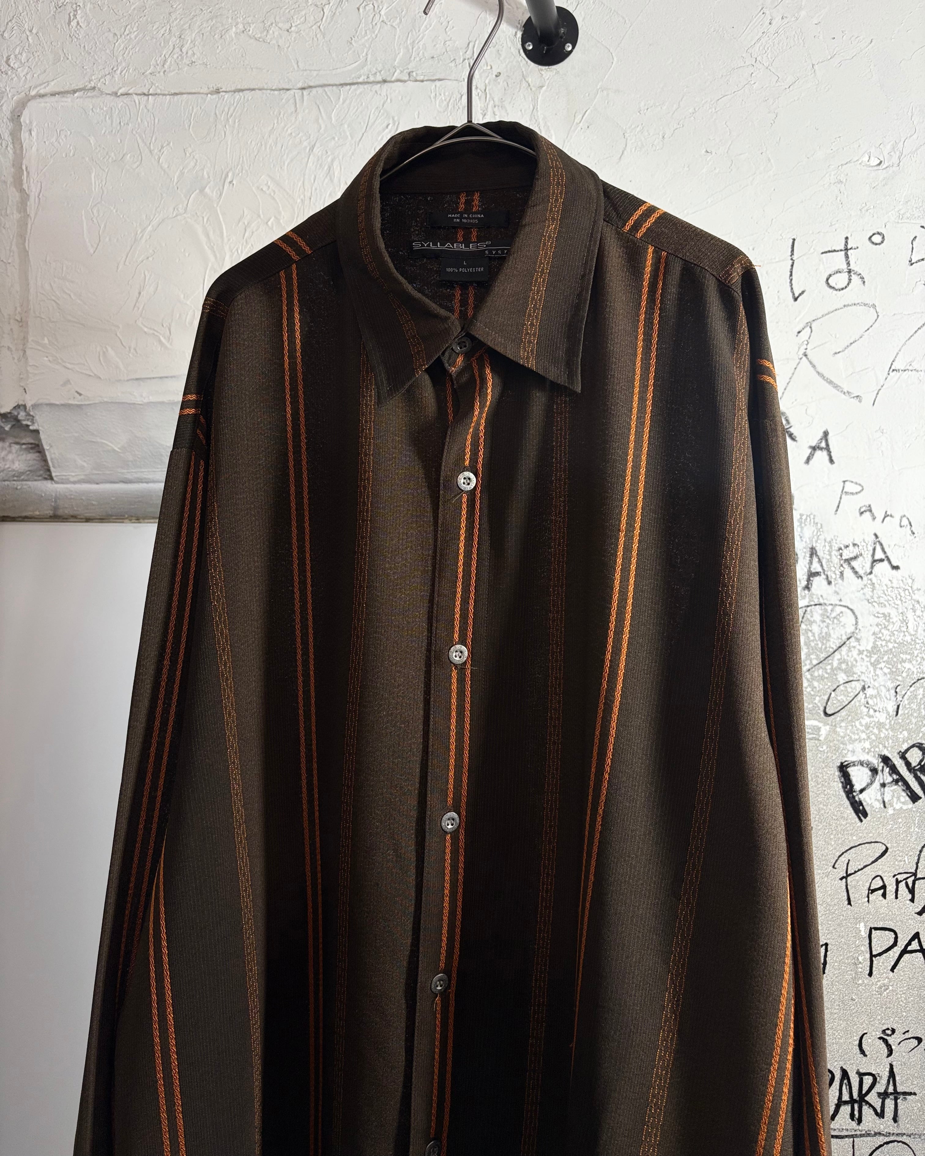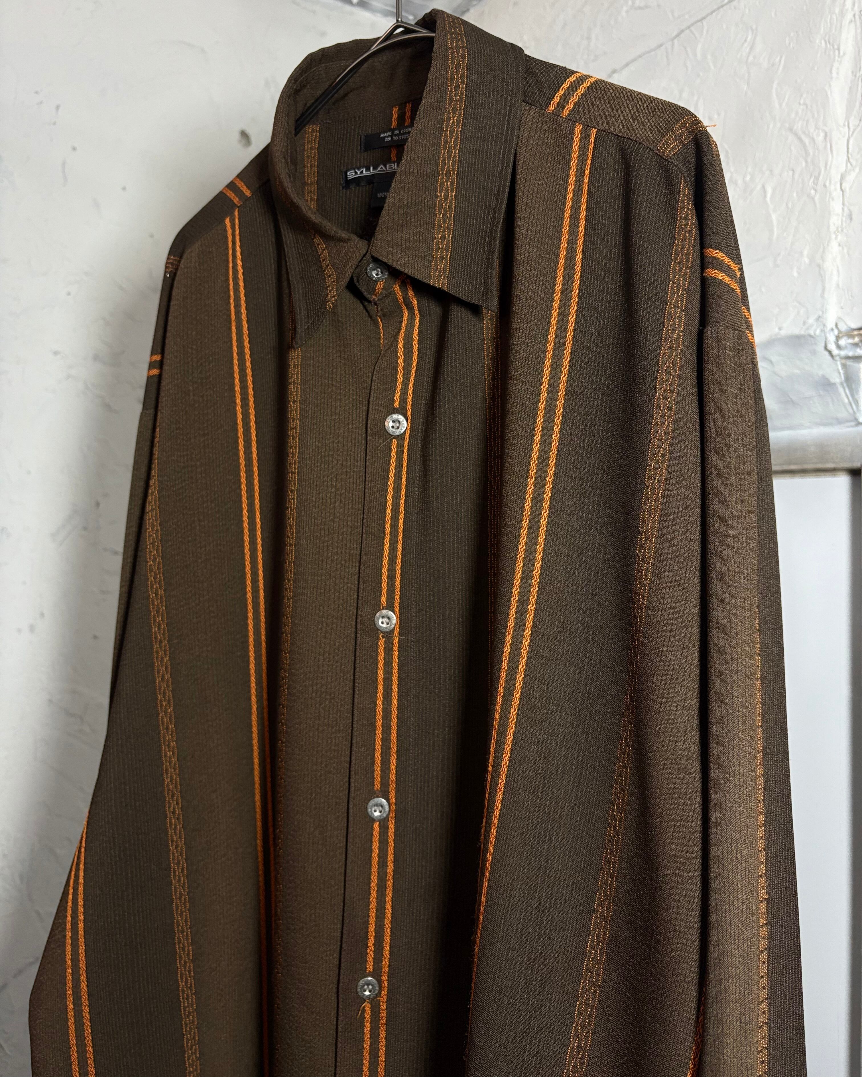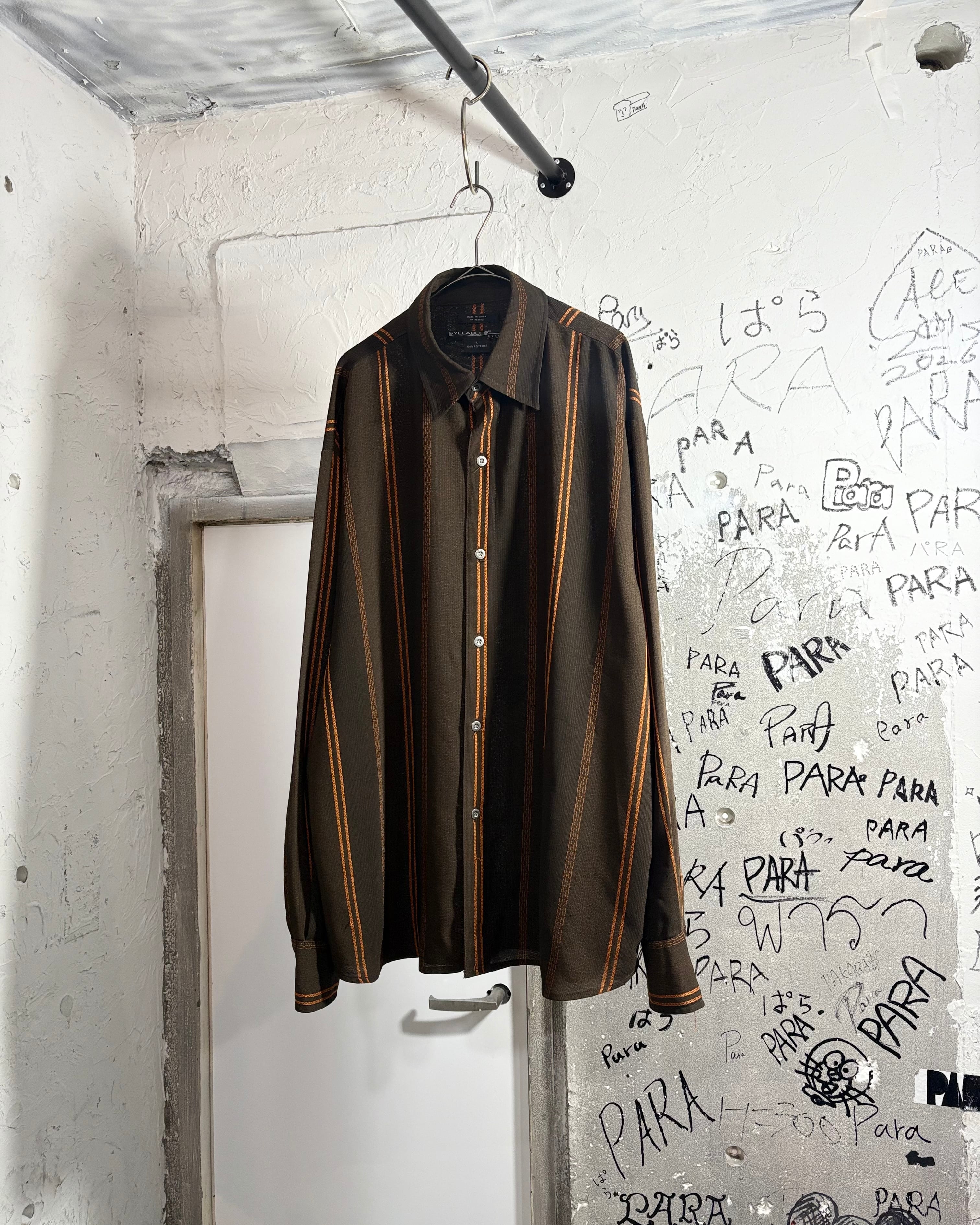 ダークブラウンベースにオレンジ〜アンバー寄りストライプ柄シャツ