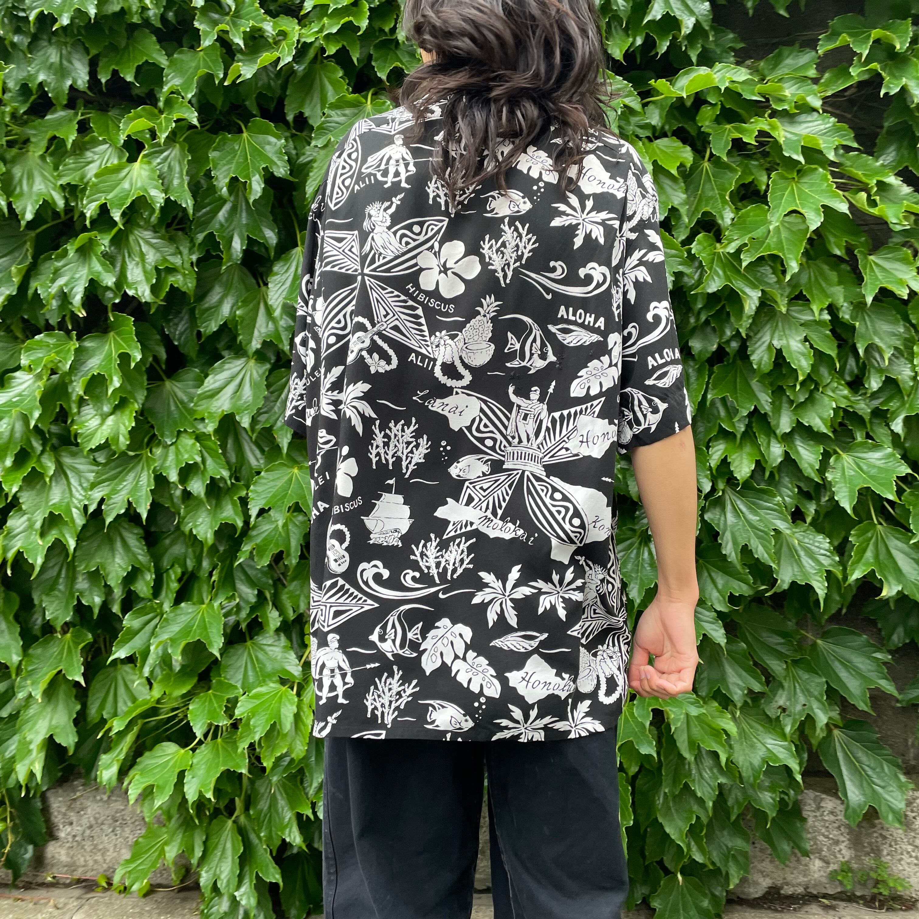 カメハメハ大王銅像、フラガール、リーフ、パイナップル、船、魚、貝のオールオーバーパターン。