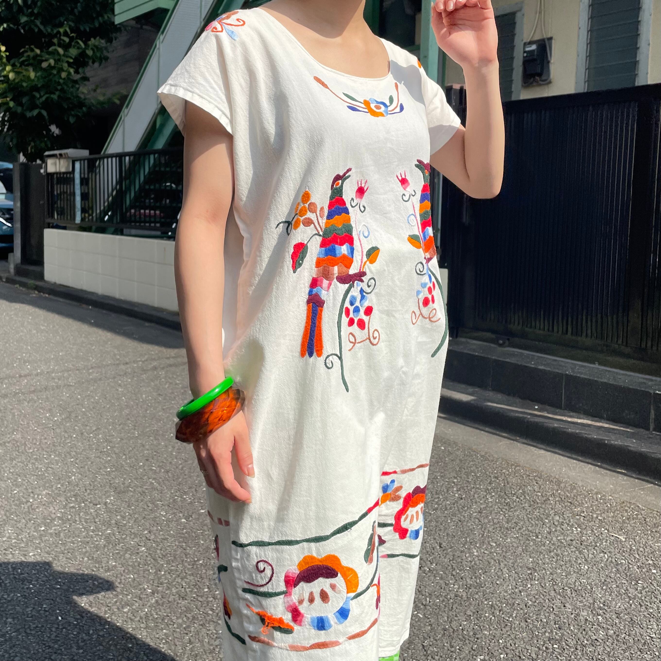 メキシコ刺繍・マサテコ族の孔雀刺繍ワンピース