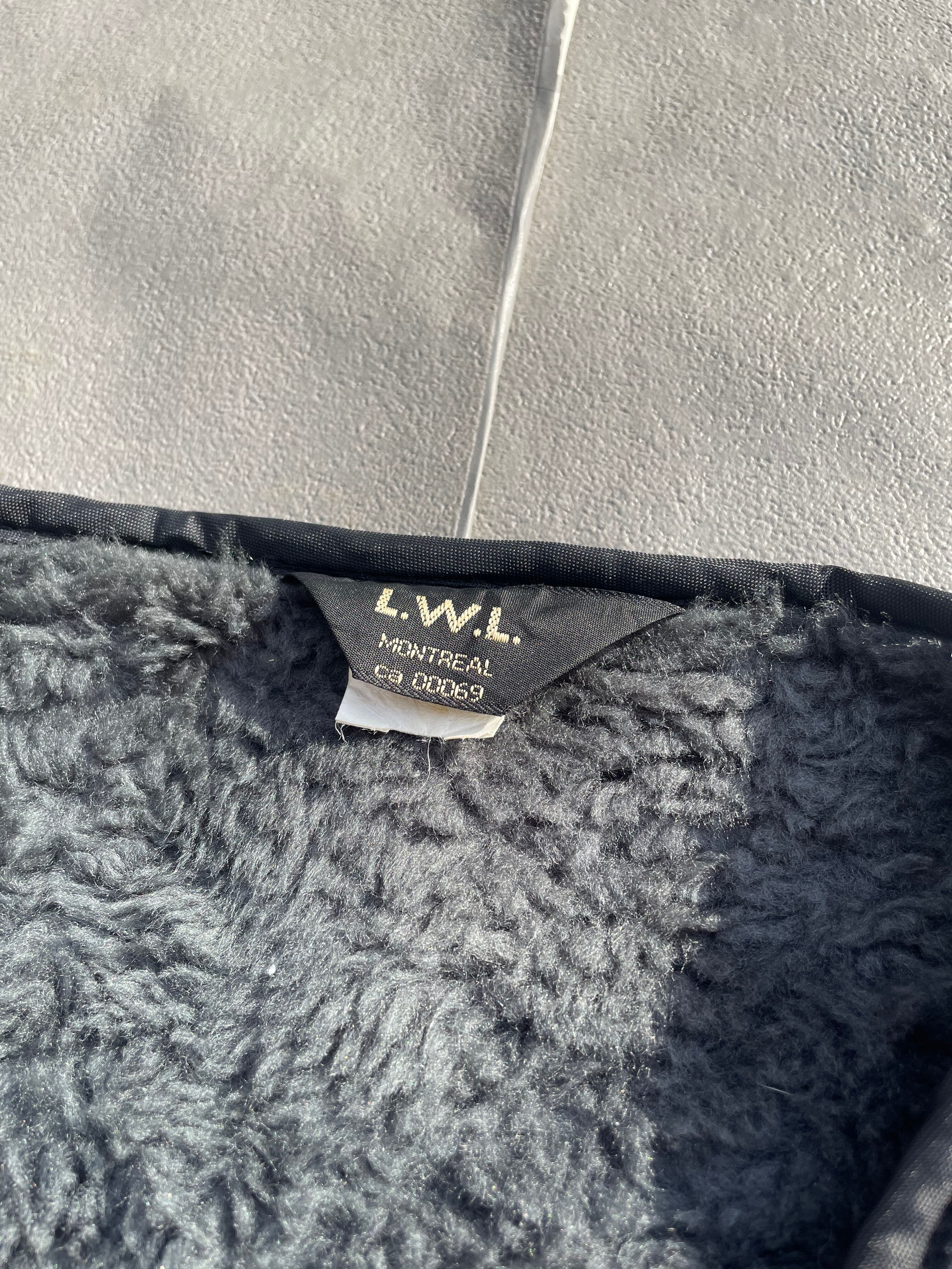 後ろ見頃が長く、フロントはジッパー、グレーのボアのディテール。