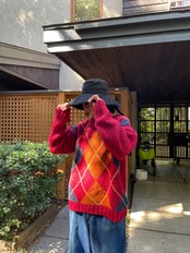 目を惹く赤につぶらな多色ネップ、そして大判のダイヤモンドチェック。
