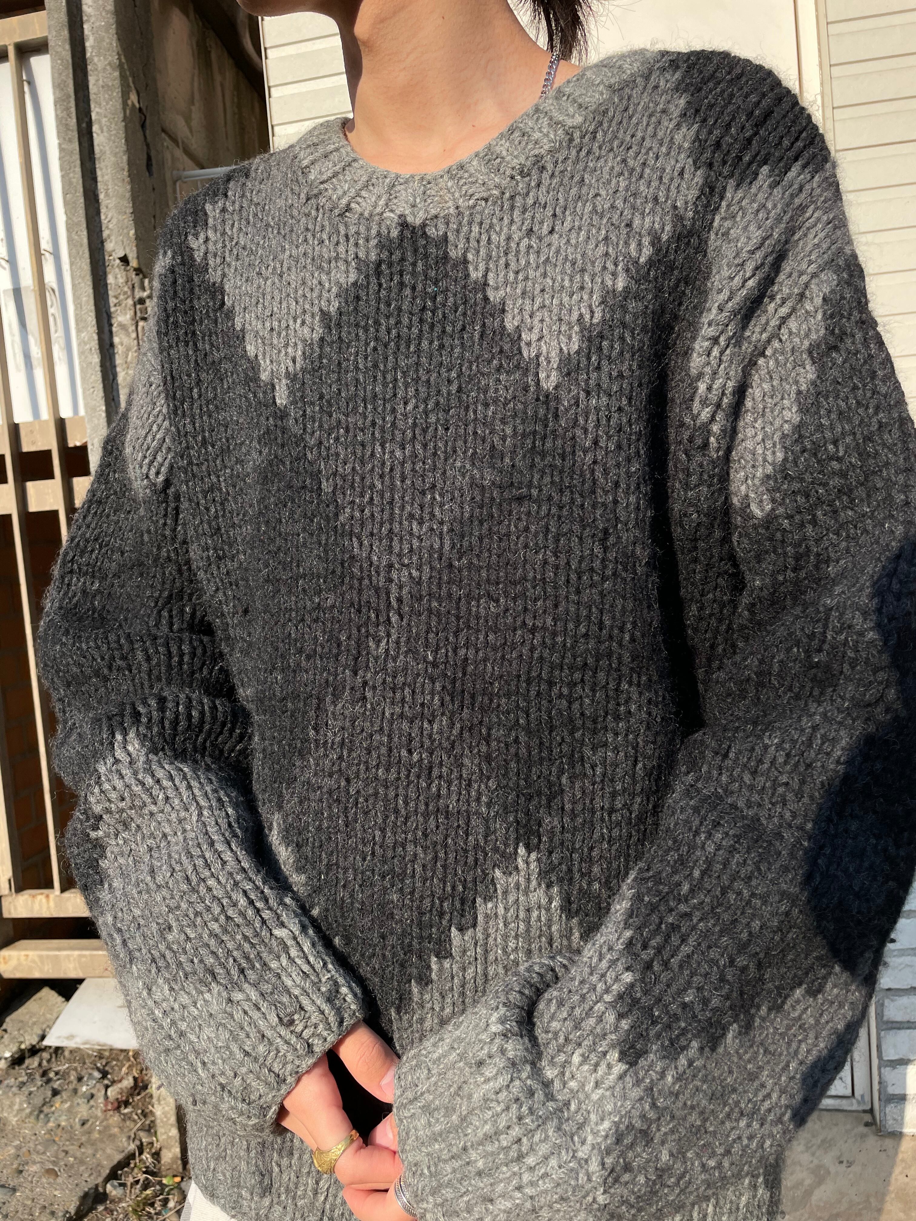 大判のダイヤモンドチェックをモノトーンで統一したシックなニット。