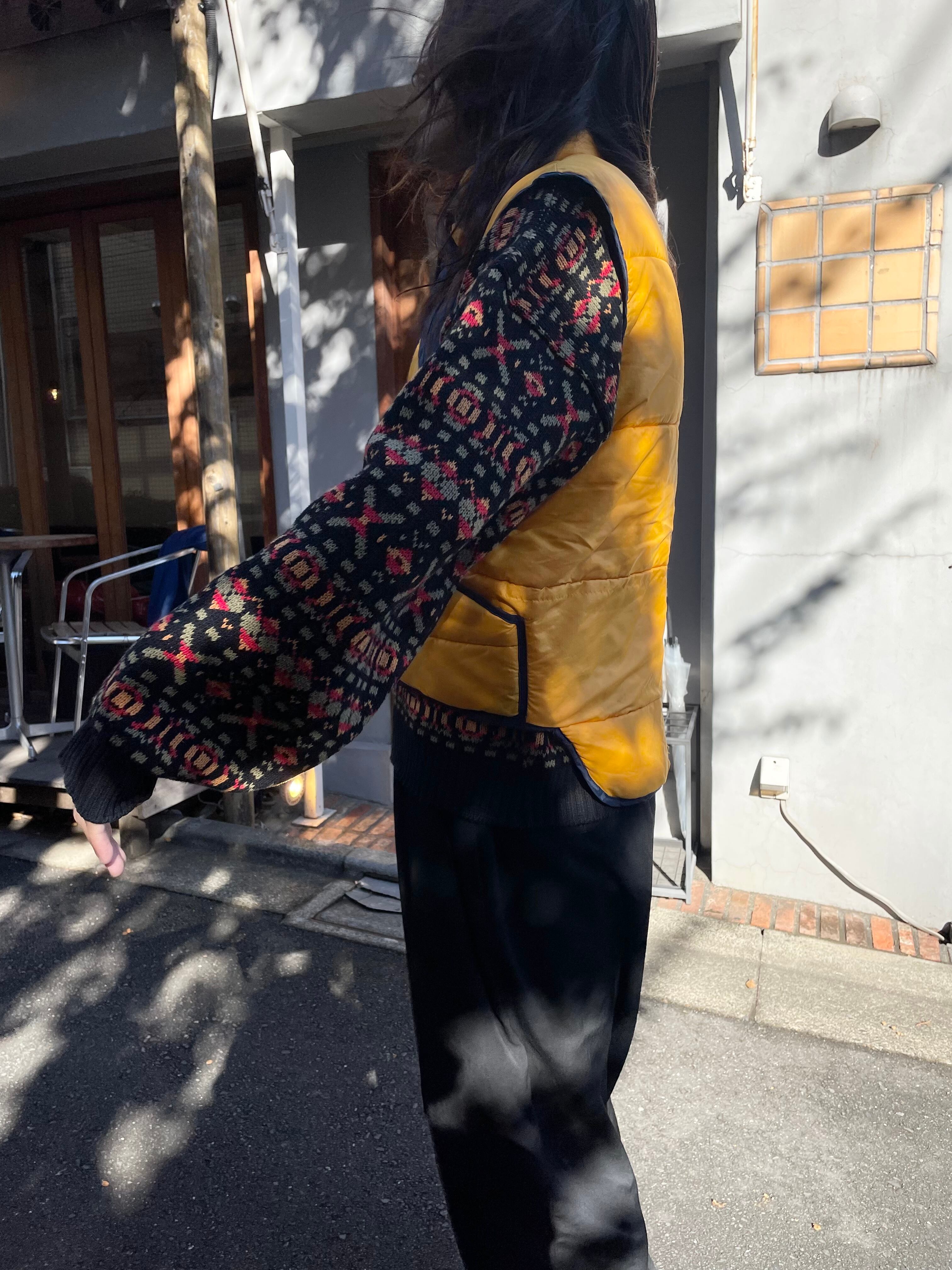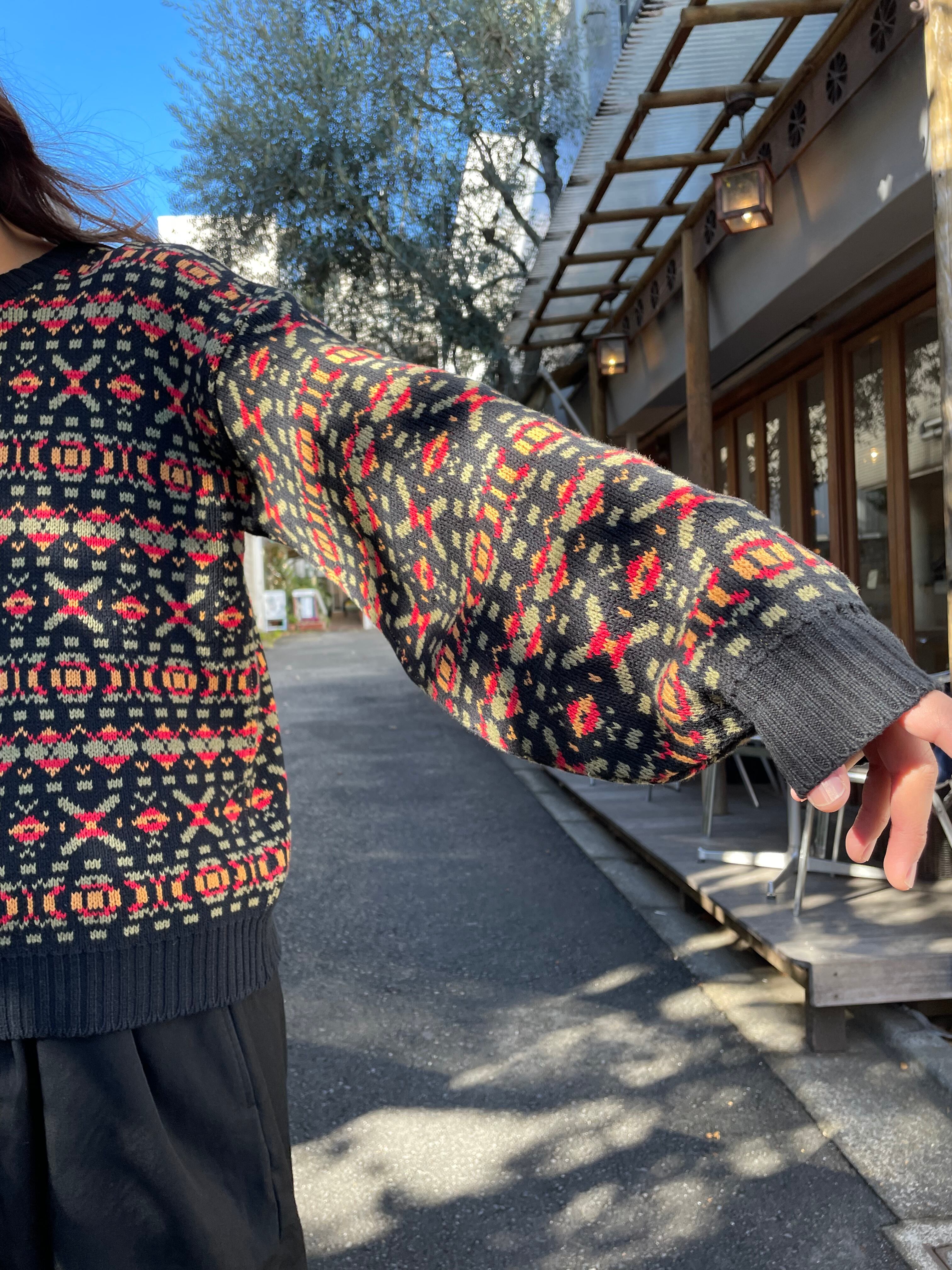 弛みを持たせたバルーンワイドスリーブの総柄コットンニット。