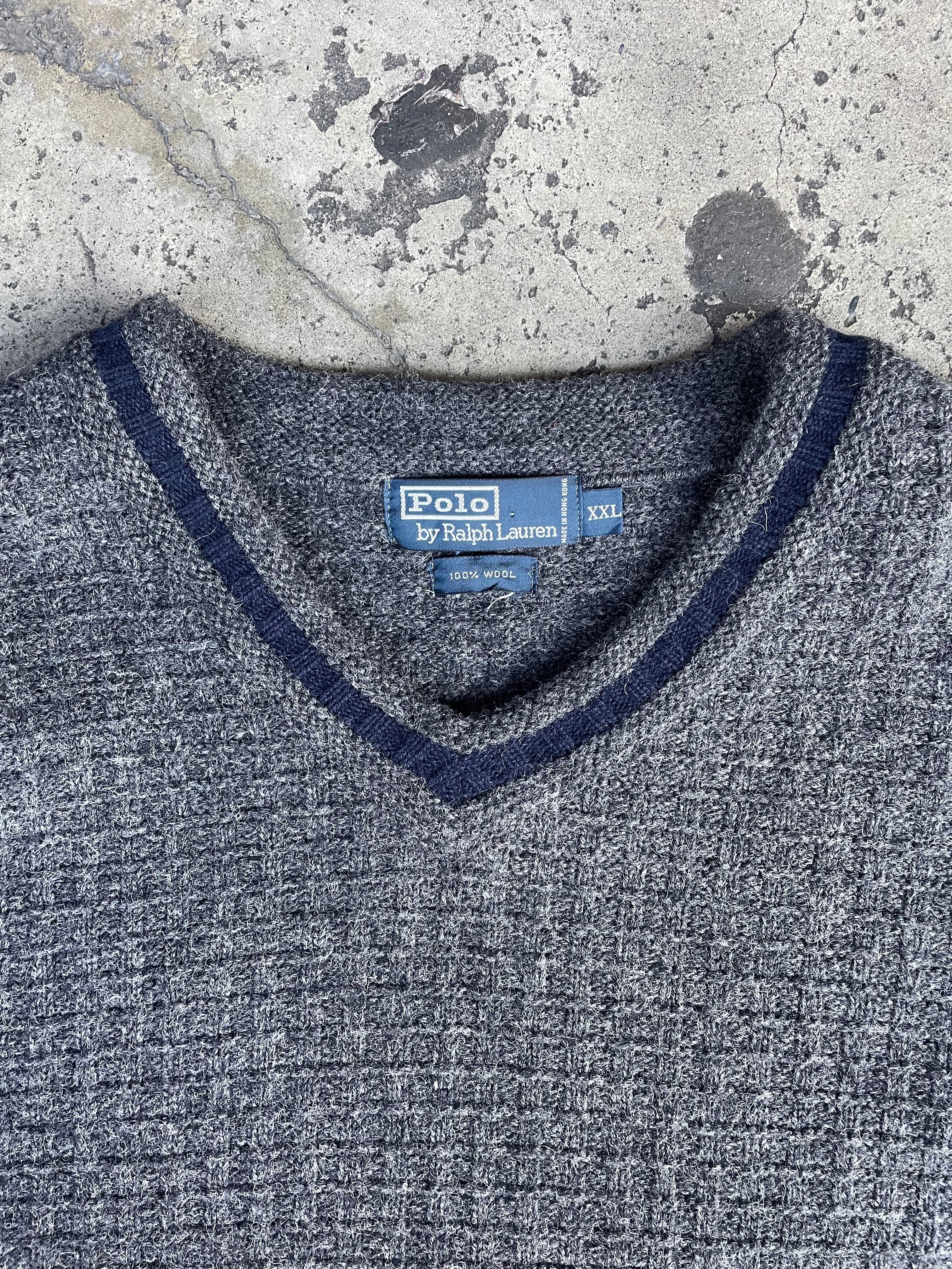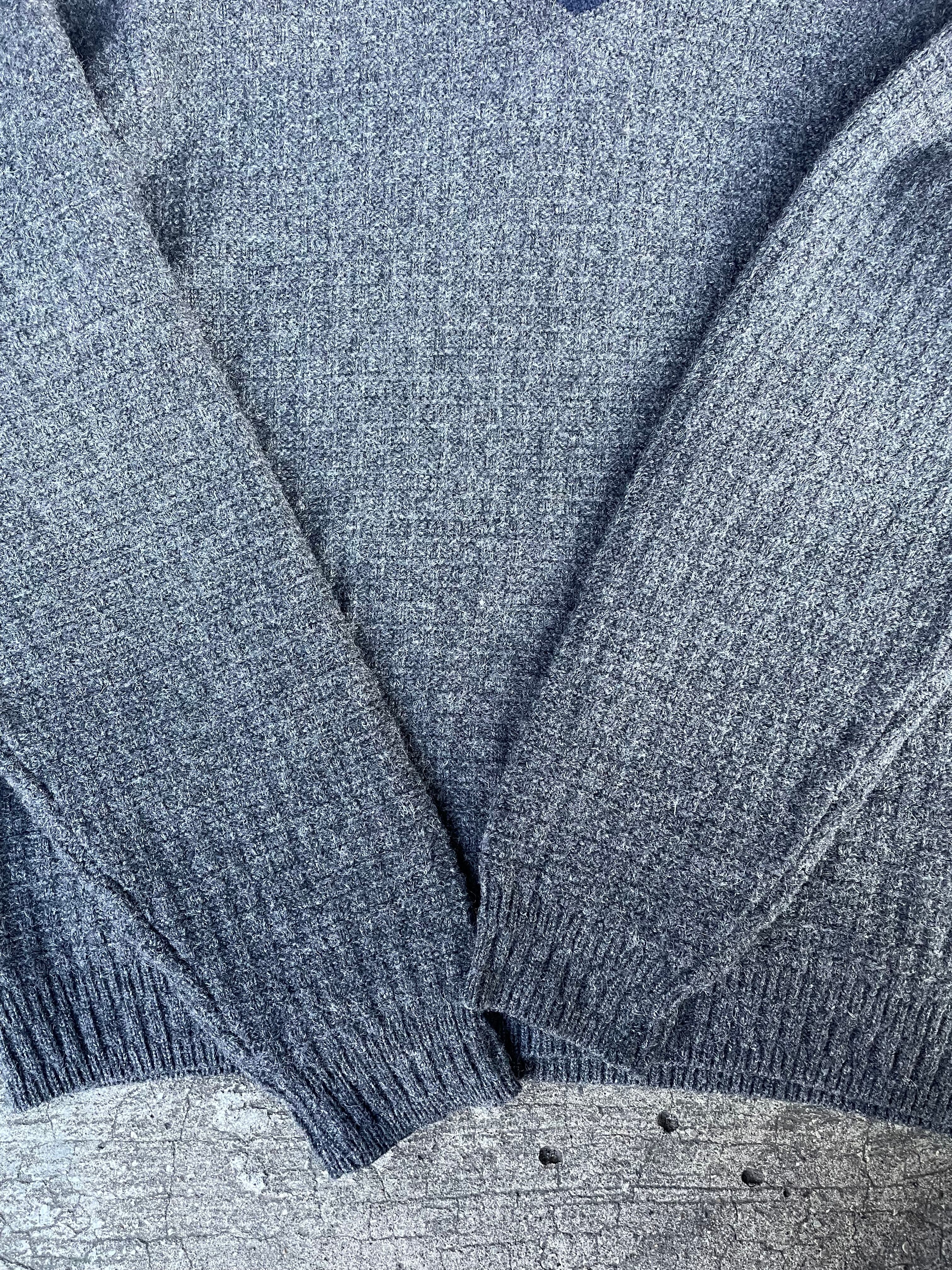 チャコールグレーにネイビーのラインにVネック、渋い色味ですが何処か垢抜けた様なデザイン。