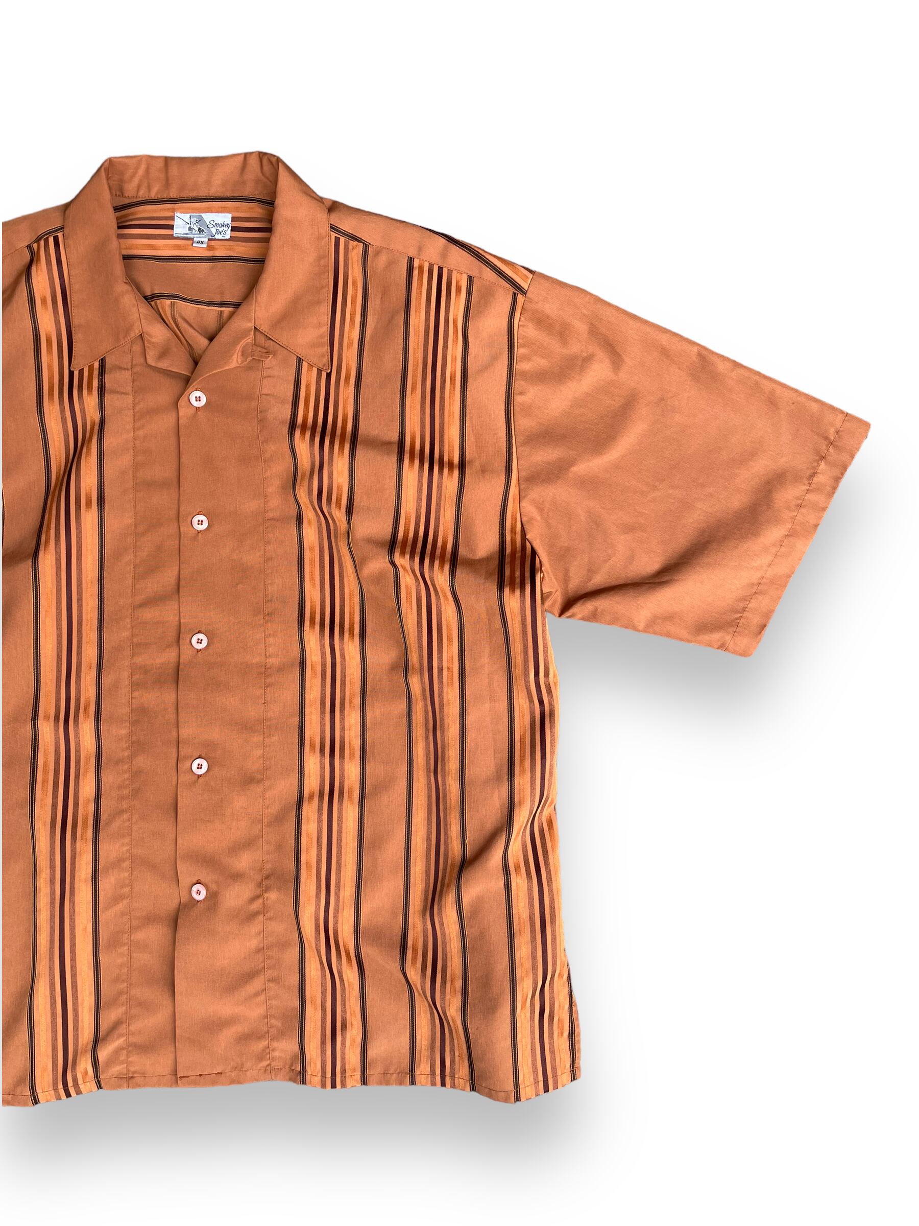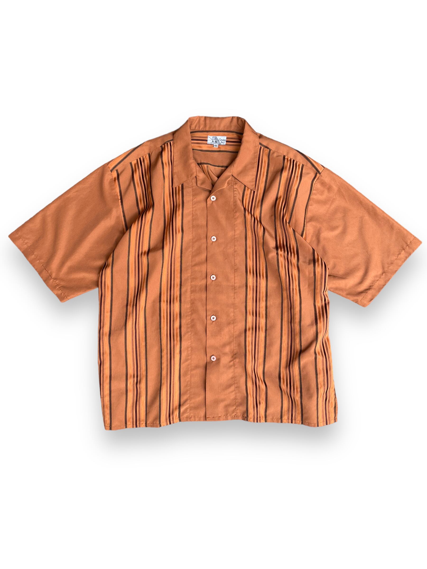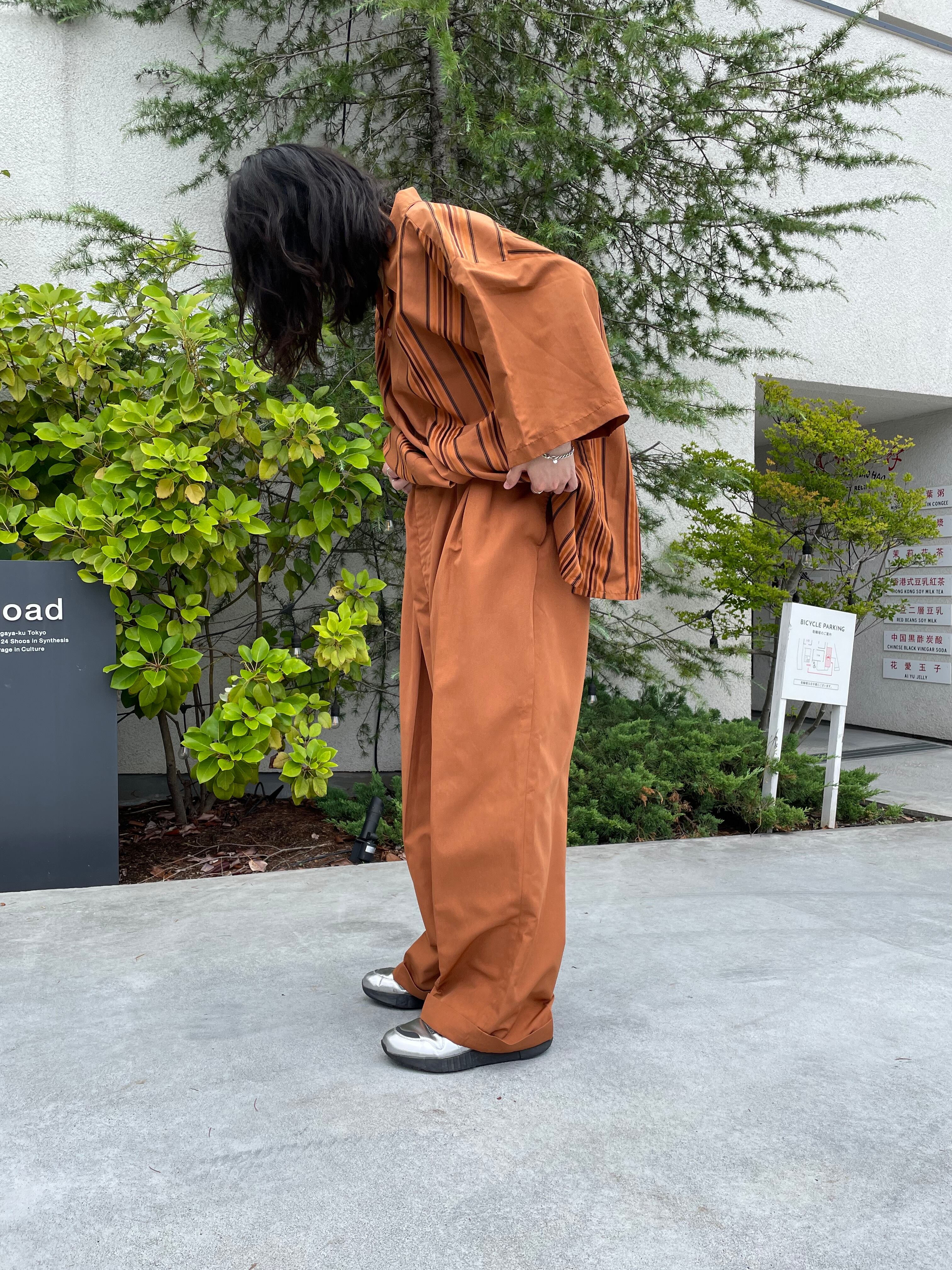 シックなストライプシャツに極太のスラックスとアイテムの良さもあり、ハズシとして緩さ。