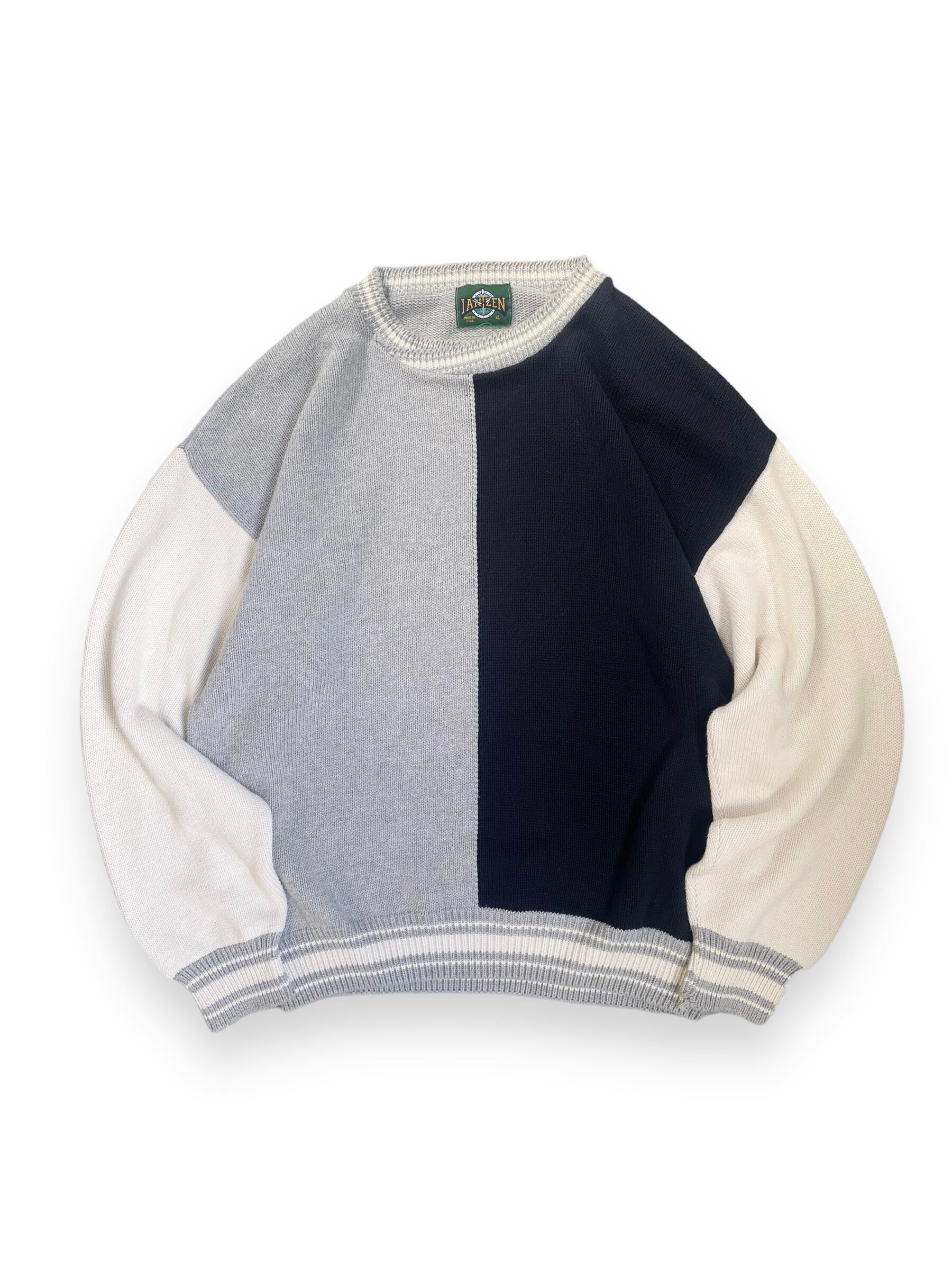 大胆な切替ながらライトグレー、ネイビー、アイボリーの品の良いカラーリング。