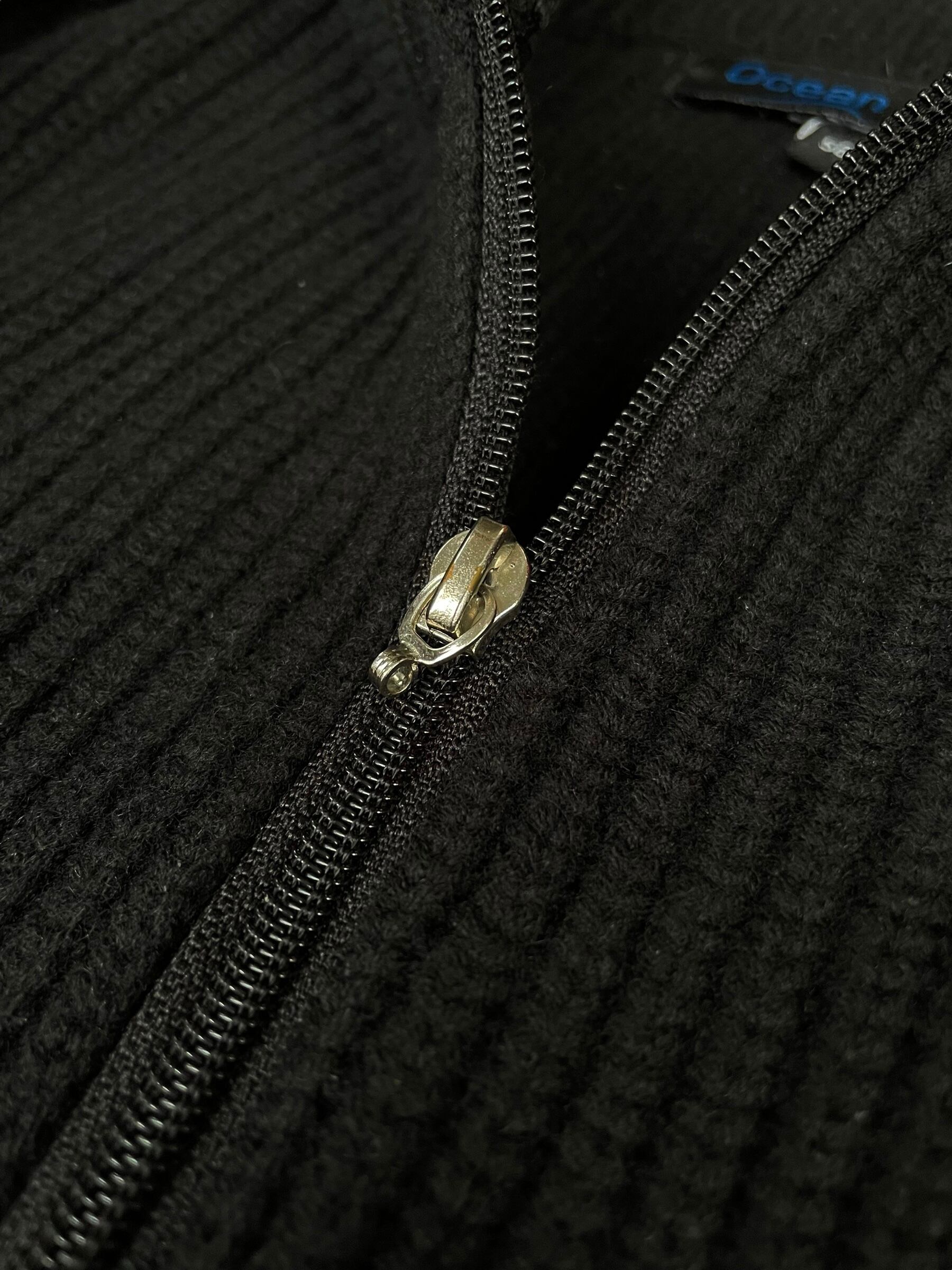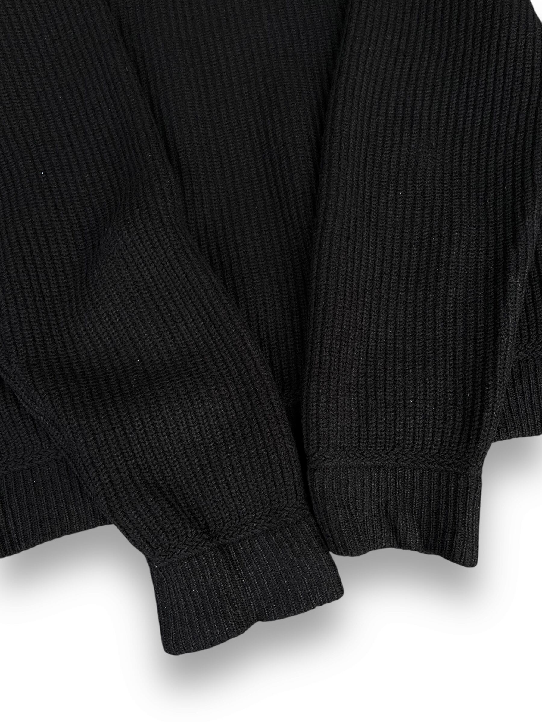 ハイネックでも、襟を開けてニットシャツ的にも、ボリュームのある首元のリブがいい表情にしてくれます。