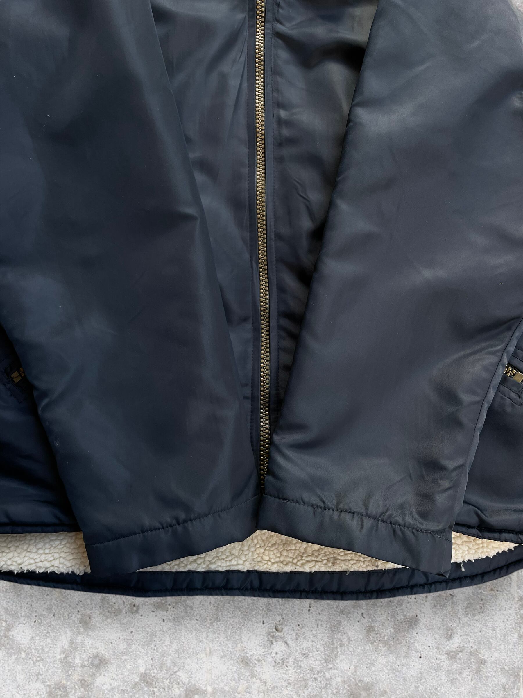 適度に光沢感のあるナイロン生地に、裏地と襟のボアと重過ぎない雰囲気。