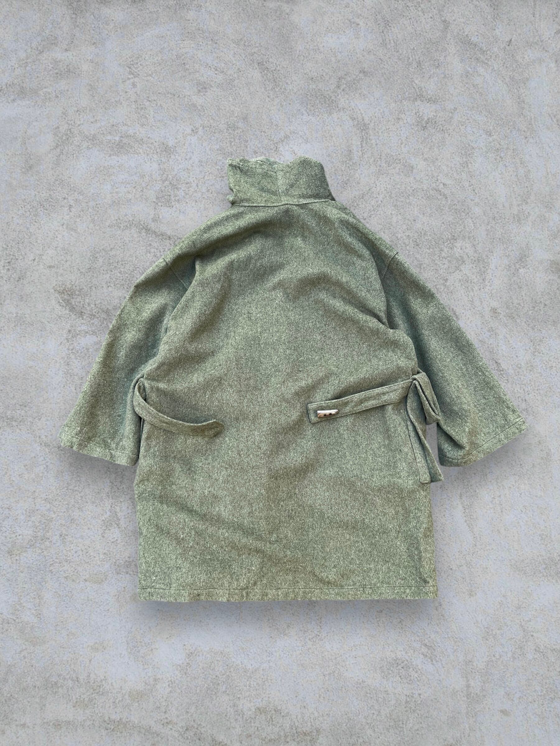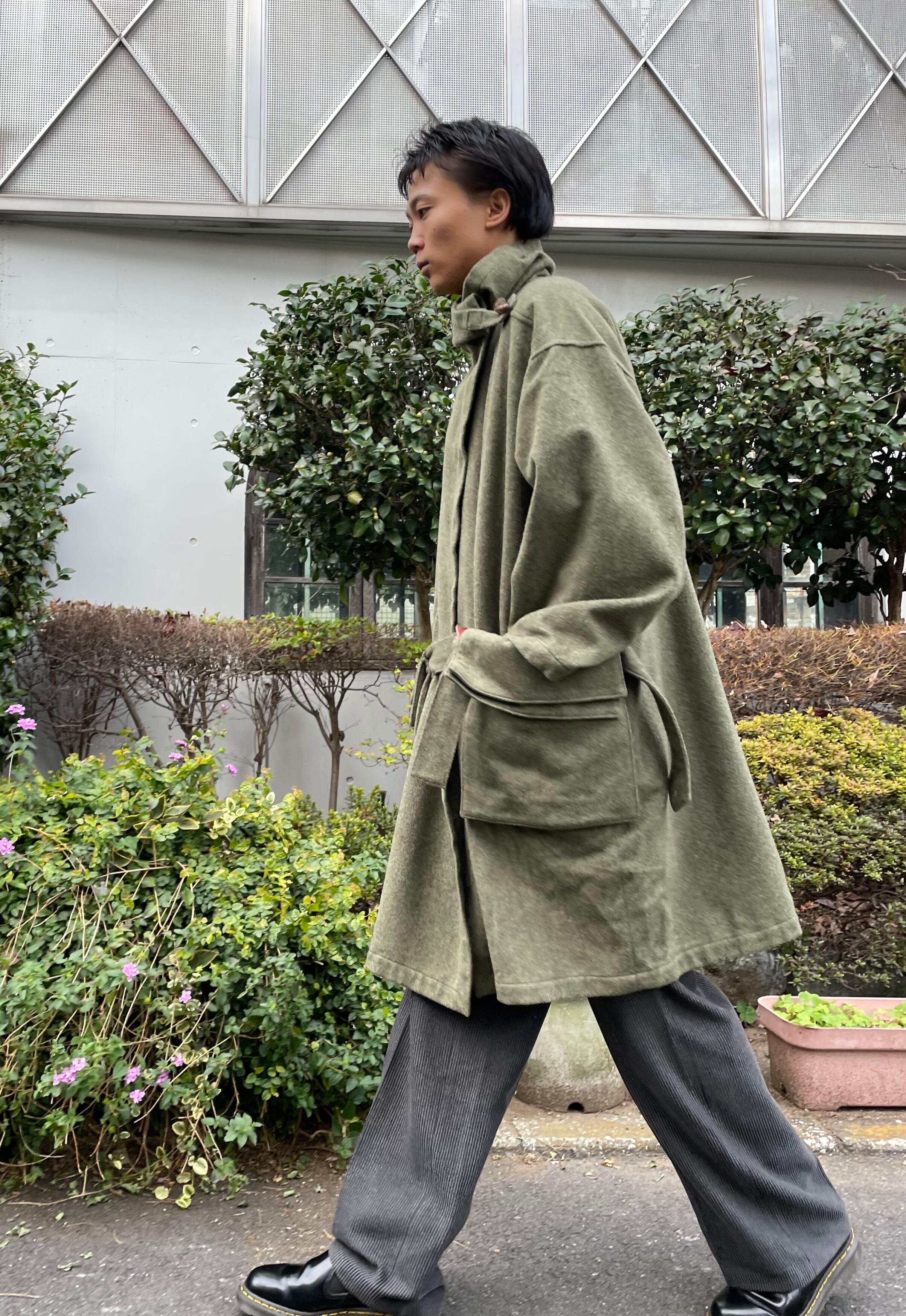 ローブコートのようなヴィジュアルに二重フラップのポケット、前後のベルト、ネックのトグル、ハイネックと当ブランドでは有り得ないてんこ盛りデザインです。